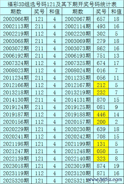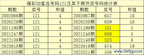 一、开奖精采:第2025320期福彩3D奖号为121。奖号奇偶比为2:1,和值为:4,跨度为:1。